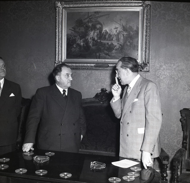 L'onorevole Achille Marazza, ministro del Lavoro e della Previdenza sociale, viene ricevuto dal sindaco Bartoli in Municipio, visita i malati, incontra il vescovo Santin, si reca a San Giusto e presenzia alla cerimonia della posa della prima pietra della nuova sede dell'Inam di Trieste.