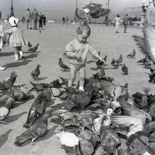 Bambino e colombi in piazza Unita' d'Italia