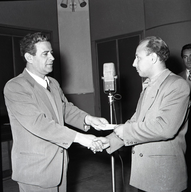 La cittadinanza ha seguito nei giorni scorsi la vicenda del piccolo bambino, affetto da una grave malattia, e ha risposto all'appello dei genitori, lanciato dai microfoni della trasmissione radiofonica "Campanon", perche impossibilitati a pagare le spese della cura. Radio Trieste ha raccolto 356.875 lire, circa il doppio di quanto necessario per effettuare l'operazione e le cure relative presso la clinica romana del prof. Valdoni. Nelle foto il direttore di Radio Trieste, Ronald Rimm, consegna personalmente al padre la somma, il quale dichiara di voler donare la parte in eccesso ad un altro bambino, anch'egli malato e in condizioni economiche difficili