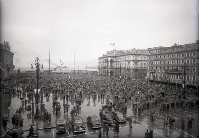 ln piazza Unita' d'Italia, sotto la pioggia, la folla attende l'arrivo delle truppe italiane.