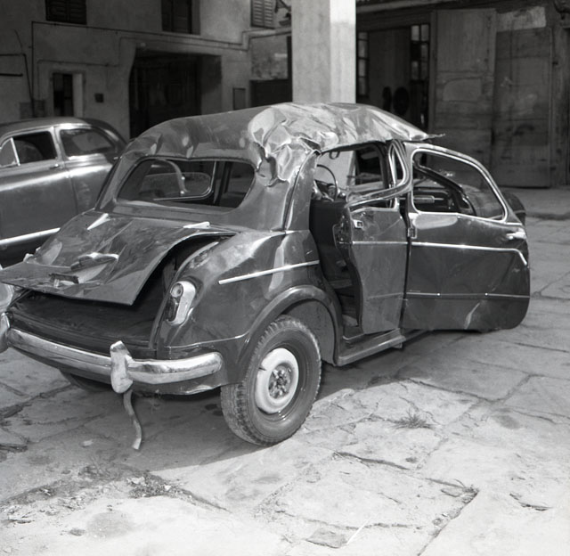 Immagini di una Fiat Millecento gravemente danneggiata.