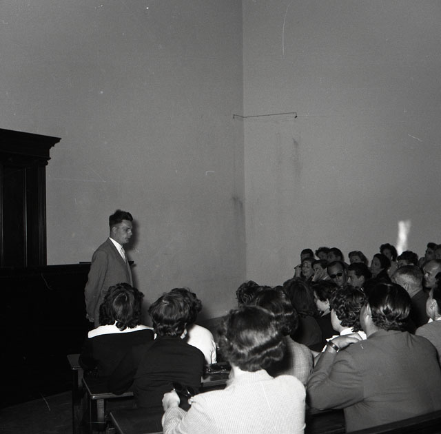 Il docente di lingue moderne tiene una conversazione sui caratteri generali del corso per la specializzazione di traduttore estemporaneo di lingue straniere previsto all'Università di Trieste per l'anno accademico 1954-1955.Testo tratto da Le ultime notizie, 25.09.1954.