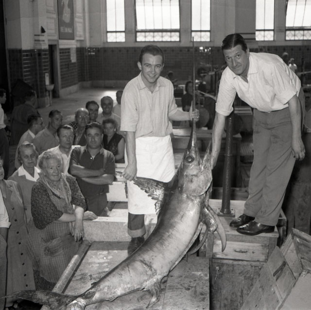 Il pesce spada catturato dal bagnino Raffaele Brecelli a Barcola viene venduto al Salone degli Incanti.