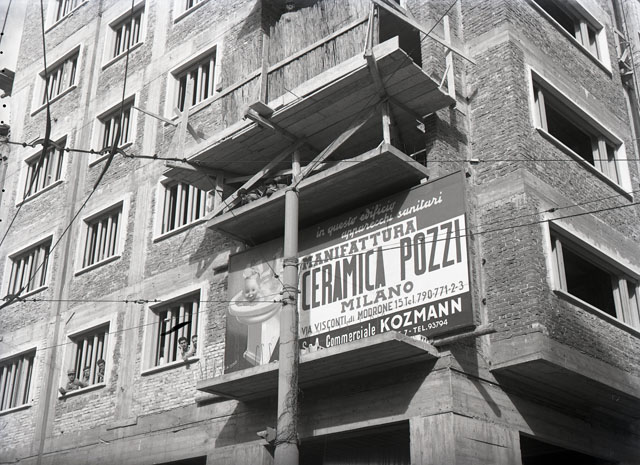 Riproduzione fotografica di un cartellone pubblicitario della Soc. commerciale Kozmann (impianti sanitari e igienici) su uno stabile in costruzione in via Udine.