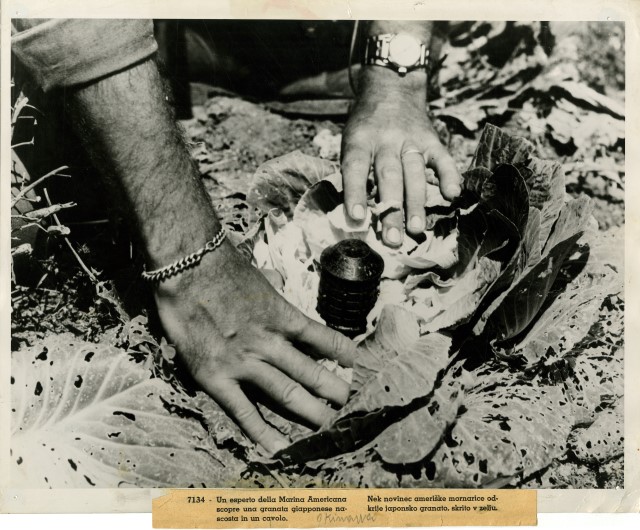 Un marinaio americano di istanza sull'isola di Okinawa mostra una granata giapponese nascosta all'interno di una pianta di cavolo.