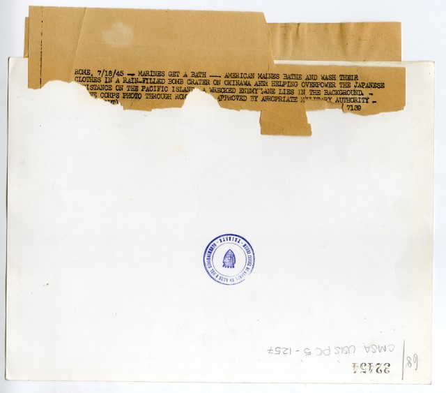 Marinai americani fanno il bagno nel cratere di una bomba pieno d'acqua piovana sull'isola di Okinawa.