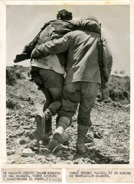 Un soldato americano, ferito durante la battaglia di Okinawa, viene portato in spalla da un commilitone per raggiungere le retrovie americane.