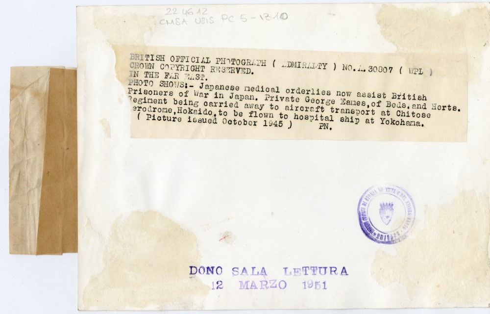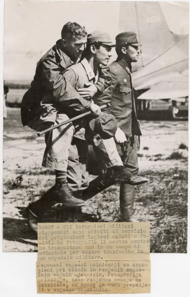 Un prigioniero inglese ferito viene portato in spalla da un medico giapponese per essere trasferito in un ospedale militare di Hokkaido.
