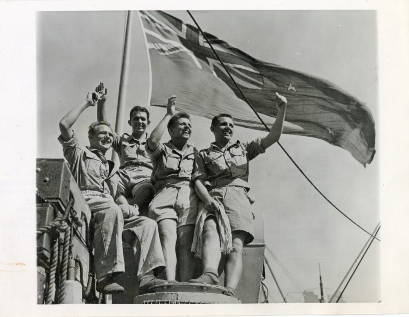 Quattro soldati inglesi, fatti prigionieri in Giappone, si trovano su una nave nel Porto di Suez che li riporterà in Gran Bretagna.