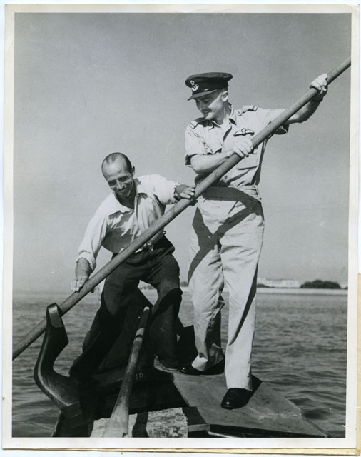 R.A.F. PILOT OFFICER CHARLES BOSTH LEARNS TO "PILOT" A GONDOLA WHILE ON HIS WAY FROM VENICE TO THE AIRFIELD AT THE VENICE LIDO.