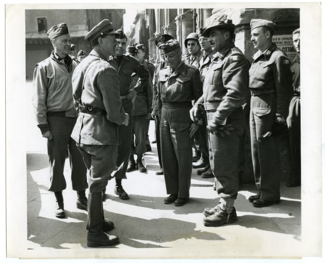 Umberto Utili (1895-1952) è stato un generale di divisione, comandante del Corpo Italiano di Liberazione durante la seconda guerra mondiale. Figlio di un ufficiale di fanteria, partecipa come tenente del 17° artiglieria al primo conflitto mondiale, quindi come tenente colonnello comandante d’artiglieria nella 1ª divisione eritrea nella guerra in Africa orientale nel 1936 in cui fu decorato al valore militare nella battaglia di Mai Ceu. Nel secondo conflitto mondiale è impegnato nel 1940 come colonnello al comando d’artiglieria del XXVI C.A. nella campagna di Grecia e sul fronte russo con lo C.S.I.R. nello stato maggiore del generale Giovanni Messe, l’8 settembre si trova in Puglia, quando le truppe alleate cominciano l’avanzata verso nord. A fine gennaio 1944 subentrò al generale Vincenzo Dapino al comando del Primo Raggruppamento Motorizzato che sotto il suo comando viene trasformato nel Corpo Italiano di Liberazione, alle dipendenze dell’8ª Armata britannica. Dopo le battaglie dei primi mesi del 1944 il generale Utili propone agli alleati un potenziamento delle forze italiane, gli alleati accettano e l’organico viene portato a 25.000 uomini suddiviso in gruppi di combattimento, Utili comandò il Legnano fino alla conclusione del conflitto. Nell’immediato dopo guerra comandò il 3° Corpo d’Armata di Milano. Morto nel 1952, è sepolto nel cimitero militare di Mignano Monte Lungo, dove sono state raccolte 975 caduti durante la guerra di liberazione. Testo tratto dal sito https://www.combattentiliberazione.it/corpo-italiano-di-liberazione-c-i-l Feldmaresciallo britannico (contea di Tyrone, Irlanda settentr., 1891-Slough, Londra, 1969). Partecipò alla Prima guerra mondiale, ebbe poi incarichi in India e venne nominato maggior generale (1937). Nella Seconda guerra mondiale comandò (1940) il corpo di spedizione britannico durante la ritirata di Dunkerque; trasferito in Medio Oriente (1942), divenne poi comandante in capo delle forze britanniche nell’Africa settentr. (1943) e, poco dopo, delle forze alleate in Italia; il 28 sett. 1943, insieme al generale Eisenhower, ricevette il maresciallo Badoglio per la firma dell’armistizio «lungo». Ebbe parte decisiva nella condotta della campagna d’Italia: suo il proclama che nel nov. 1944 invitava i partigiani a sospendere le operazioni su vasta scala. Il 26 nov. 1944, promosso maresciallo e divenuto comandante supremo delle forze alleate nel Mediterraneo, prese anche il comando delle operazioni di sbarco nella Francia meridionale. Dal 1946 governatore generale del Canada e visconte, fu anche ministro della Difesa (1952-54). Testo tratto da https://www.treccani.it/enciclopedia/harold-rupert-leofric-george-alexander_(Dizionario-di-Storia)/
