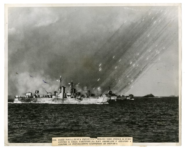 Lancio di razzi americani contro navi giapponesi durante la battaglia di Okinawa.