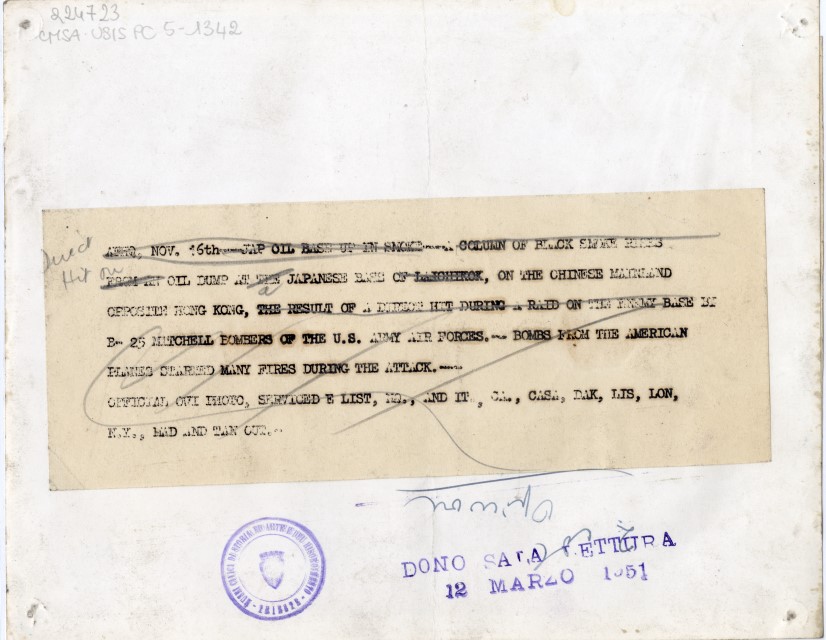 Incendio proveniente da un deposito di lubrificanti giapponesi a seguito di un attacco aereo americano ad Hong Kong.