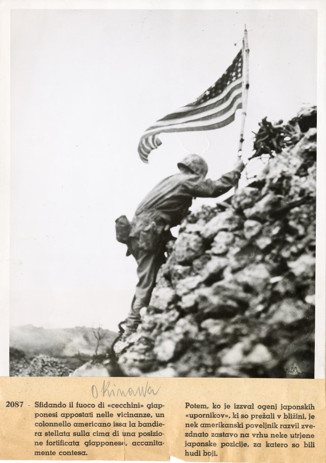 Un Marine sta per issare la bandiera americana sulla cima del castello Shuri, sull'isola di Okinawa.