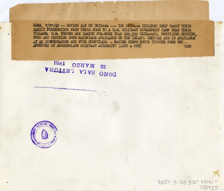 Due bambini di Okinawa aiutano a trasportare gli averi di famiglia dal loro villaggio ai campi americani.