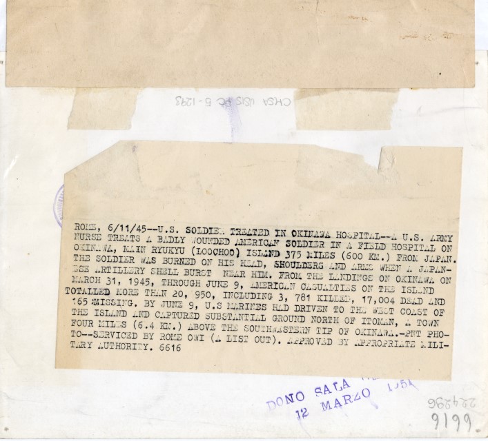 Un'infermiera cura un soldato americano ferito al volto dallo scoppio di una granata giapponese sull'isola di Okinawa