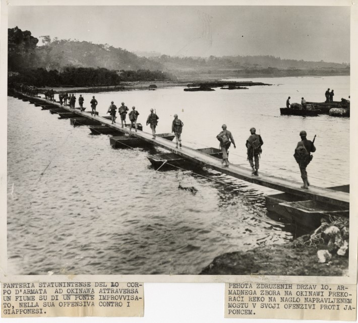 La fanteria statunitense attraversa un fiume su un ponte costruito con delle barche e continua la sua offensiva contro i giapponesi sull'isola di Okinawa.