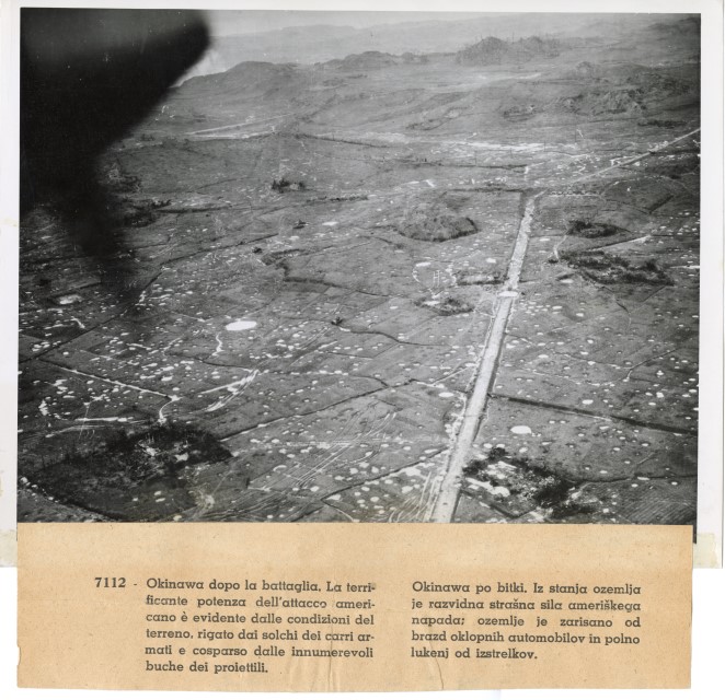 Veduta aerea di Okinawa dopo i bombardamenti aerei americani.