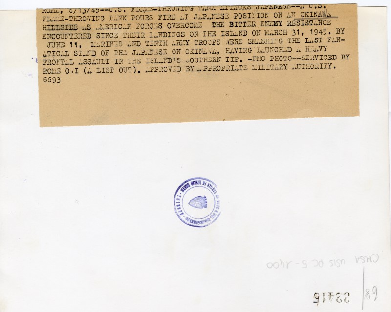 Un carro armato lanciafiamme americano attacca una posizione giapponese sull'isola di Okinawa.