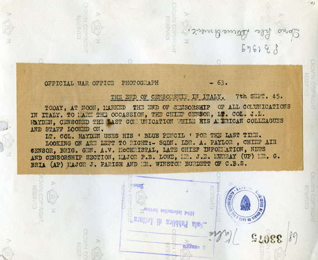 La fine della censura militare in Italia. Il capo della Censura Ten. Col. Hayden adopera per l'ultima volta la matita azzurra.