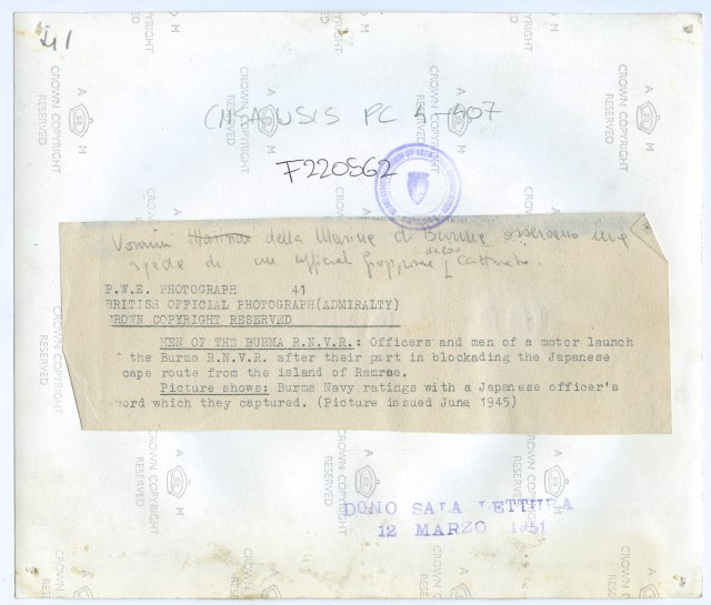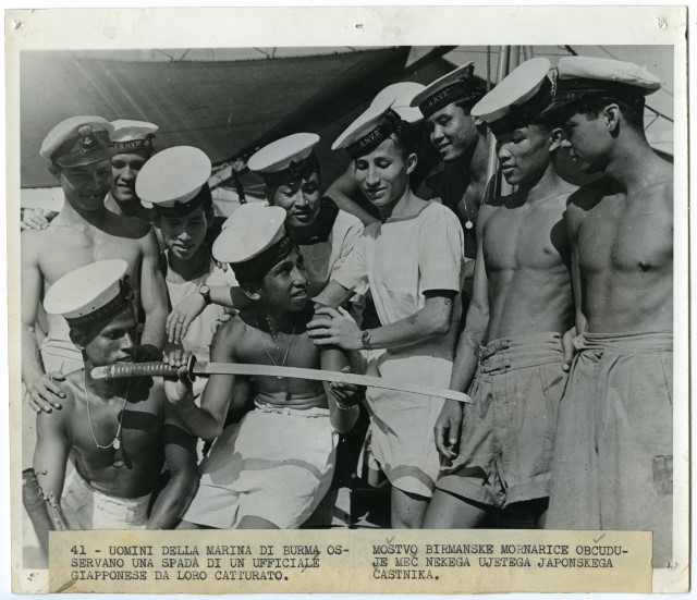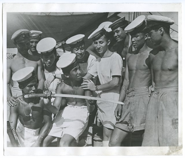 Marinai inglesi osservano la spada di un ufficiale giapponese appena catturato
