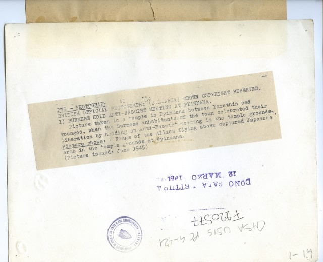 Birmani partecipano a una riunione antifascista a Pyinmana. Le bandiere inglesi e sovietiche troneggiano sopra le armi confiscate ai giapponesi
