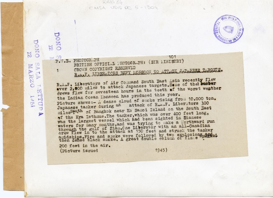 Veduta aerea di una nave giapponese in fiamme a seguito di un bombardamento da parte dell'Aviazione britannica