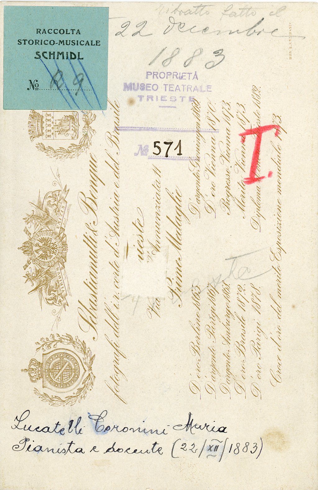 Maestra di pianoforte, sposata al violinista Carlo Coronini (1849-1900); nel 1930 dona al Museo Schmidl spartiti, fotografie di artisti e cimeli di famiglia