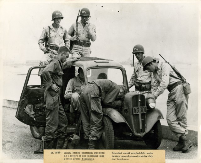 Una truppa americana dell'undicesima divisione aerea ispeziona il motore di un'automobile giappponese nella città di portuale di Yokohama, invasa il 29 agosto 1945.