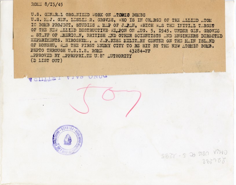 Il Generale Leslie R. Groves studia una carta geografica dell'Asia durante i preparativi per il lancio della bomba atomica.