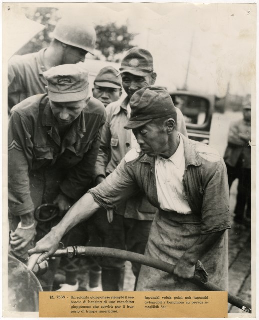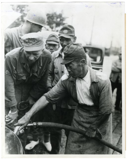 Un soldato giapponese riempie il serbatoio di un'automobile, che servirà al trasporto delle truppe americane.