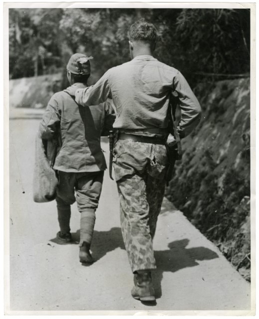 Un Marine americano accompagna un soldato giapponese prigioniero nelle retrovie americane sull'isola di Okinawa.