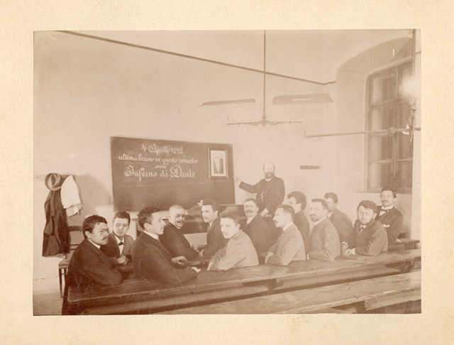 Gruppo di allievi con Filippo Zamboni: ultima lezione in questo semestre sull'Inferno di Dante: Vienna 4 aprile 1892