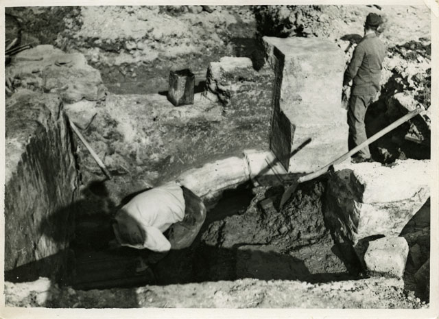 Scavo del teatro romano di Trieste.La foto inquadra i resti del muro del frontescena in corso di scavo nel tratto corrispondente all'apertura centrale, la porta regia, che si apriva sulla destra del pilastro. È emersa la porzione inferiore del muro di fondo caratterizzato da un profilo a nicchie definito da una base marmorea modanata sui cui si imposta un nucleo interno in muratura.La buona conservazione dei resti ha consentito la ricostruzione pressoché completa del frontescena: al centro vi era un'esedra semicircolare dove si apriva la valva regia mentre ai lati trovavano posto due esedre rettangolari all'interno delle quali vi erano altre due aperture, le valvae hospitales. All'interno delle esedre, ai lati delle porte, erano collocate delle basi che forse sostenevano colonne posizionate ai lati degli accessi. Erano probabilmente destinate a impreziosire il frontescena le state rinvenute nel corso dello scavo, molte delle quali trovate proprio davanti alla scena, nell'iposcenio.