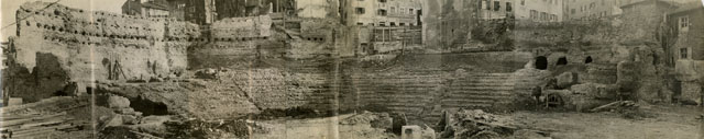 Veduta del teatro romano in corso di scavo. Il teatro è stato scavato solo parzialmente: è stato messo in luce il muro perimetrale, che si conserva per buona parte in elevato, e la porzione superiore della gradinata, mentre giace ancora sotto terra la parte inferiore dell'ima cavea. Rimane da scavare anche la zona dell'orchestra e la parte della scena, di cui si vede in primo piano unicamente il pilastro della porta regia (collocata al centro della scena) tra le macerie degli edifici moderni ancora da demolire.