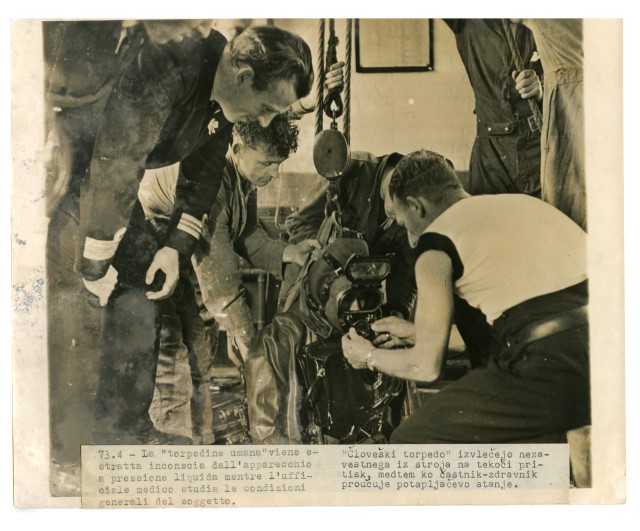 La "torpedine umana" viene estratta inconscia dell'apparecchio a pressione liquida mentre l'ufficiale medico studia le condizioni generali del soggetto