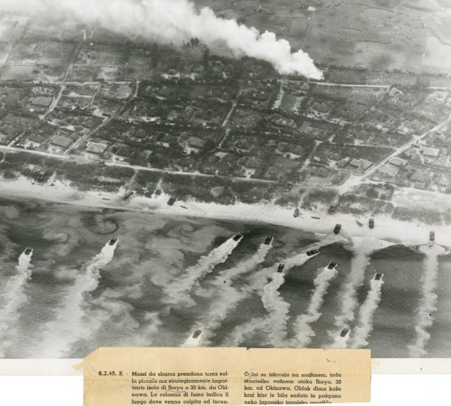 La flotta della Marina americana sta per sbarcare su Iheya, una piccola isola dell'arcipelago di Ryukyu. La veduta aerea mostra, inoltre, l'incendio di una postazione di artiglieria giapponese a seguito di un bombardamento americano.