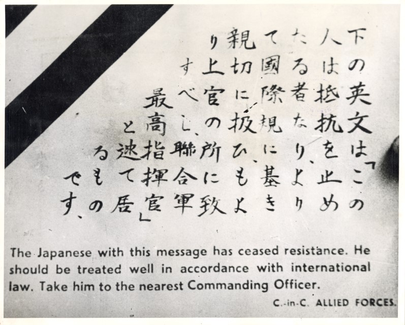 Fotografia di un volantino, scritto in ideogrammi giapponesi, che annuncia la resa del Giappone. Migliaia di questi volantini sono stati lanciati da aerei sull'Isola di Bougainville. E' presente anche un testo in inglese: The Japanese with this message has ceased resistance. He should be treated well in accordance with internationals law. Take him to the nearest Commanding Officer. C.-in-C. ALLIED FORCES.