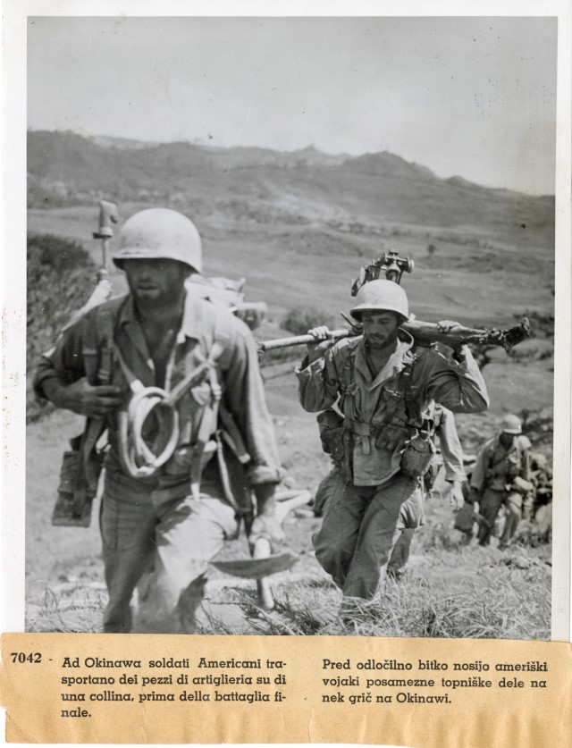 Alcuni soldati americani trasportano dei pezzi di artiglieria a Okinawa