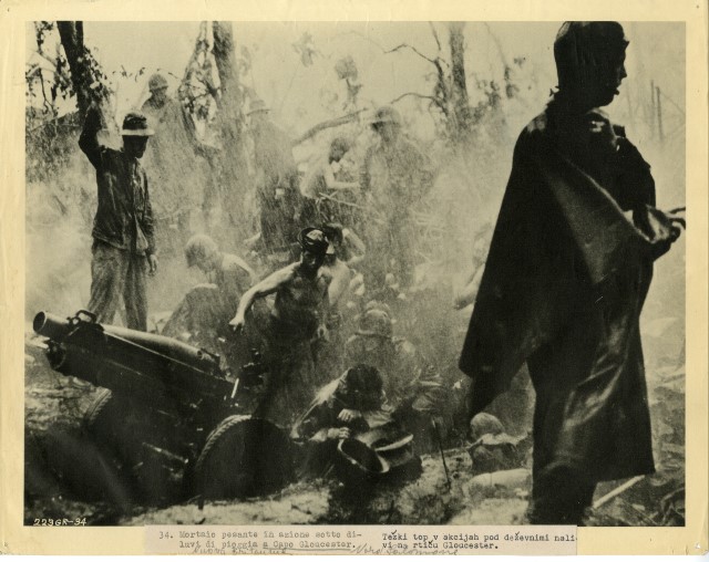 Mortaio pesante in azione sotto diluvi di pioggia a Capo Gloucester