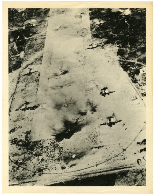 Nell'immagine, ripresa da un aereo, è possibile vedere aerei in fiamme dopo un attacco nemico.