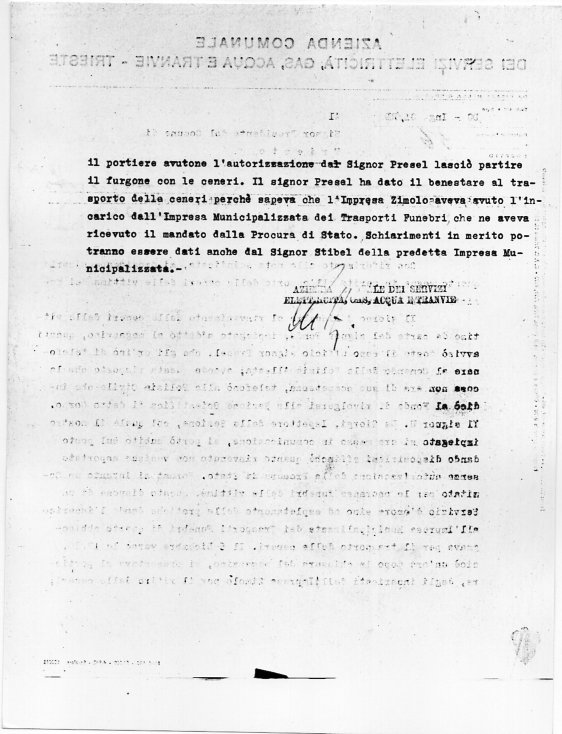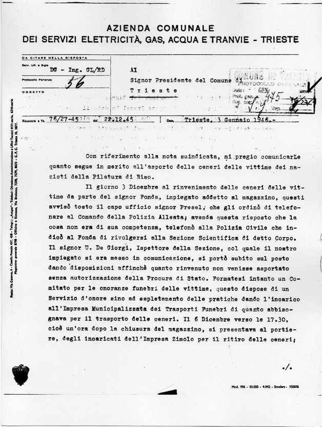 Rapporto dattiloscritto dalla azienda comunale dei servizi di elettricità, gas, acqua e tranvie di Trieste sui ritrovamenti di resti umani nella Risiera di San Sabba
