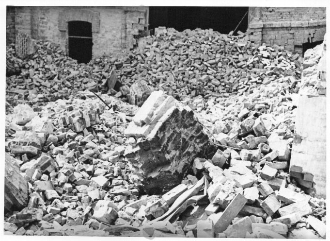 In primo piano macerie del forno crematorio, sullo sfondo un altro edificio rimasto danneggiato dallo scoppio