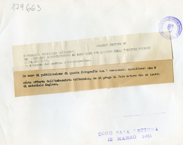 Gli abruzzesi ricostruiscono le loro case con l'aiuto della "British friends Ambulance Unit". L'arrivo dei mattoni a Colledimacine