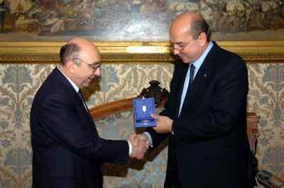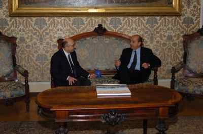 Il sindaco Roberto Dipiazza durante l'incontro con il Soprintendente ai Beni e Attivita' Culturali Giangiacomo Martines, avvenuto nel salotto azzurro del Municipio.
