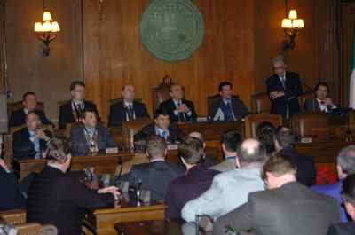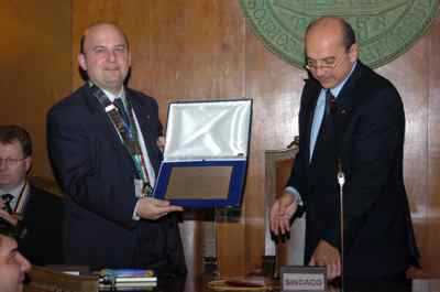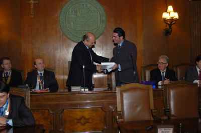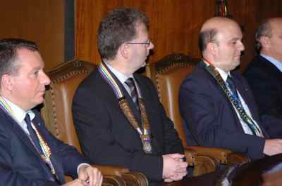 Il sindaco Roberto Dipiazza ed il Presidente del Consiglio comunale Bruno Sulli ed l'assessore comunale Maurizio Bucci con il presidente di Round Table Italia Maurizio Giudici e gli altri rappresentanti presenti al Meeting organizzato dalla Round Table Italiana in collaborazione con il Comune di Trieste, durante l'incontro avvenuto nella sala del Consiglio del Municipio.
