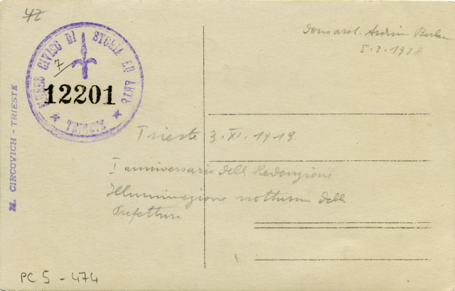 Illuminazione notturna del palazzo della Prefettura in occasione del I anniversario della redenzione di Trieste