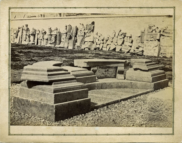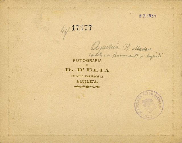 Cortile del Museo di Aquileia nella sistemazione di fine Ottocento - inizio Novecento. In primo piano una panchina realizzata con pezzi modanati di reimpiego accuratamente sovrapposti. Sullo sfondo vi sono numerosi reperti lapidei fittamente accostati e addossati al muro di cinta del museo. Si scorgono rilievi a ornato vegetale e figurato, frammenti di lapidi funerarie, elementi decorativi modanati, forse alcuni pertinenti a trabeazioni di edifici, pezzi di statue, frammenti di colonne e capitelli, ecc.