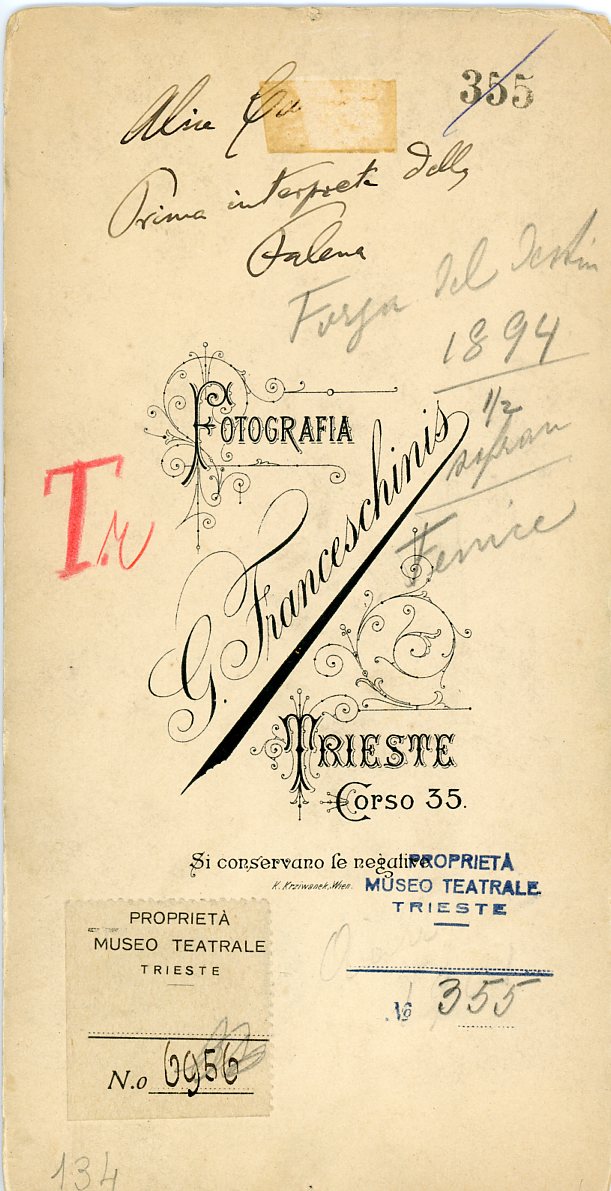 In costume. Al Politeama Rossetti di Trieste cantò nel 1891 "Ruy Blas", nel 1900 "Sansone e Dalila". Al Teatro Fenice nel 1894 "La forza del destino". Al teatro Verdi nel 1891 e nel 1894 in concerti diretti da Giulio Heller