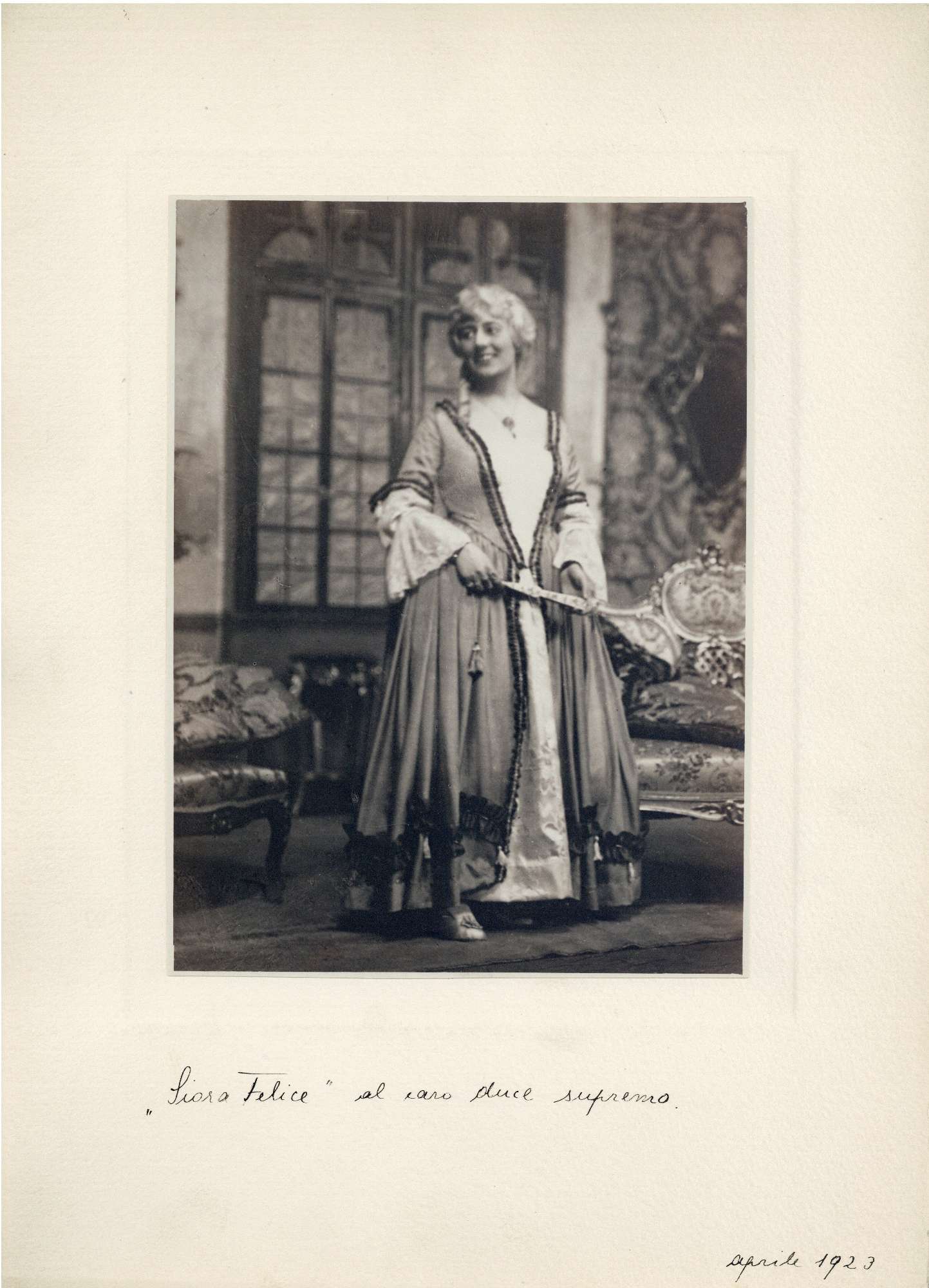 Nel ruolo di Siora Felice nella commedia Le Morbinose di Carlo Goldoni al Circolo Artistico di Trieste dal 4 al 6 aprile 1923, regia di Guido Hermet